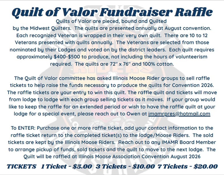 This is a Party at the end of the Year where all Moose Rider Groups of Illinois gather and just have fun. This is usually a 2-day event. On Saturday there will be dinner entertainment, raffles, 50/50, Awards, for the Breakfast Challenge, Trophy Challenge, and MROY.