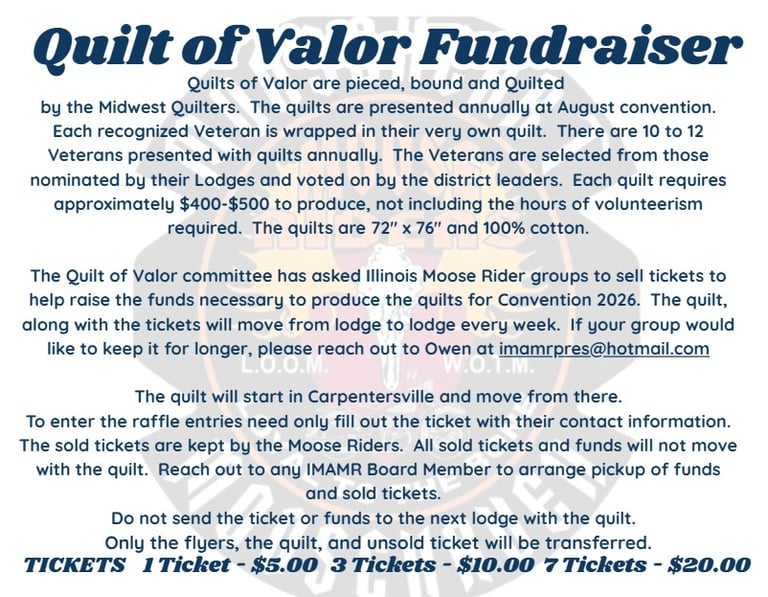 This is a Party at the end of the Year where all Moose Rider Groups of Illinois gather and just have fun. This is usually a 2-day event. On Saturday there will be dinner entertainment, raffles, 50/50, Awards, for the Breakfast Challenge, Trophy Challenge, and MROY.